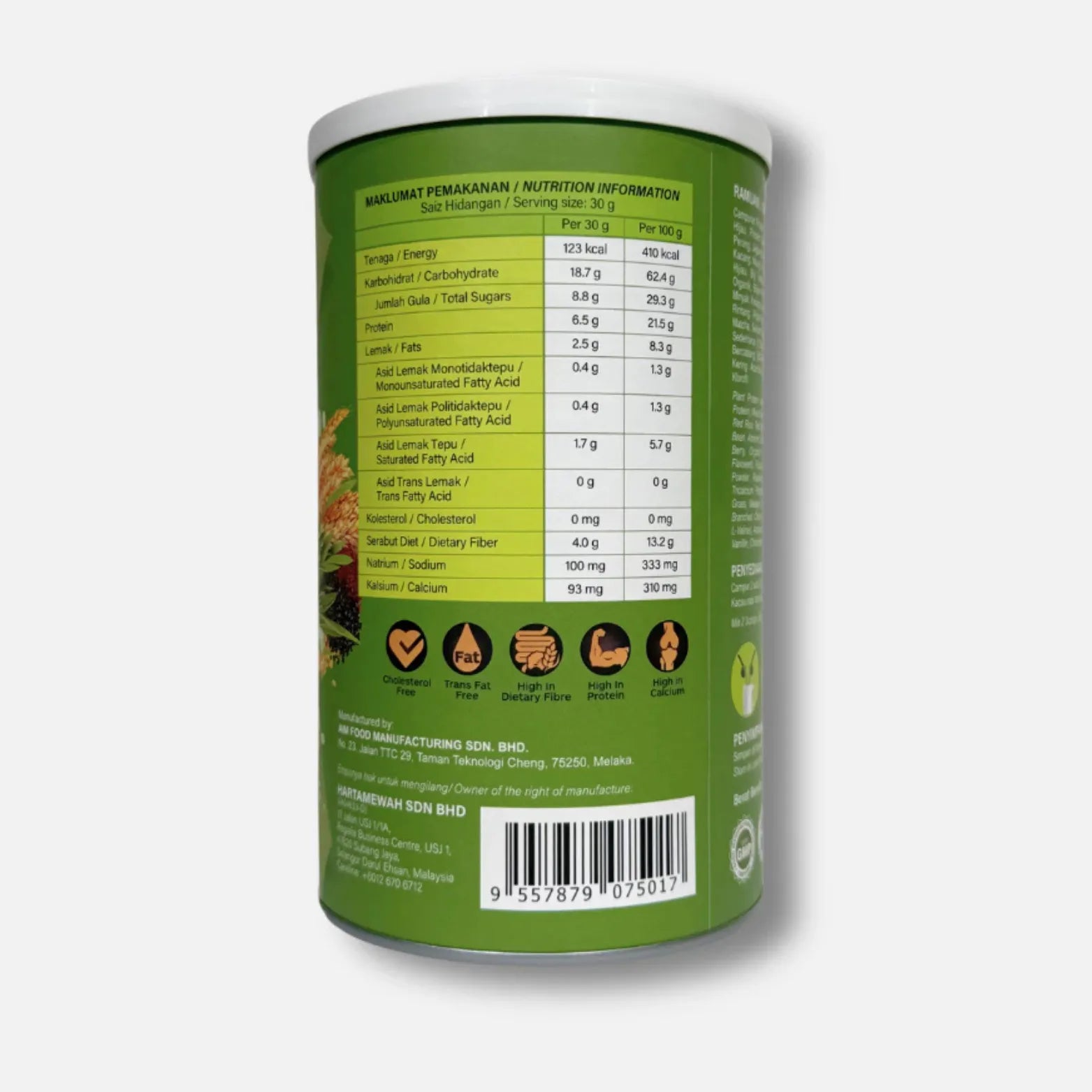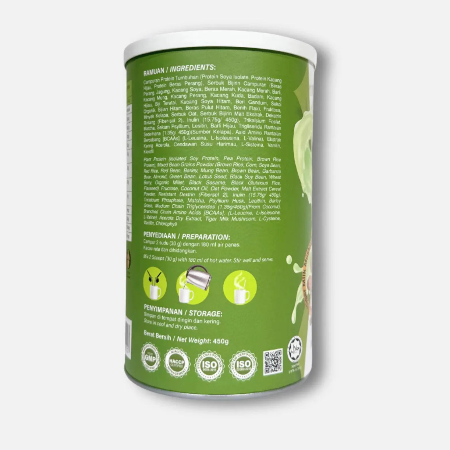 Plant Protein (Isolated Soy Protein, Pea Protein, Brown Rice Protein), Mixed Bean Grains Powder (Brown Rice, Corn, Soya Bean, Red Rice, Red Bean, Barley, Mung Bean, Brown Bean, Garbanzo Bean, Almond, Green Bean, Lotus Seed, Black Soy Bean, Wheat Berry, Organic Millet, Black Sesame, Black Glutinous Rice, Flaxseed), Fructose, Coconut Oil, Oat Powder, Malt Extract Cereal Powder, Resistant Dextrin (Fibersol 2), Inulin (15.75g/450g), Tricalcium Phosphate, Matcha, Psyllium Husk, Lecithin, Barley Grass, Medium Chain Triglycerides (1.35g/450g) (From Coconut), Branched Chain Amino Acids (BCAAs), (L-Leucine, L-Isoleucine, L-Valine), Acerola Dry Extract, Tiger Milk Mushroom, L-Cysteine, Vanillin, Chlorophyll.